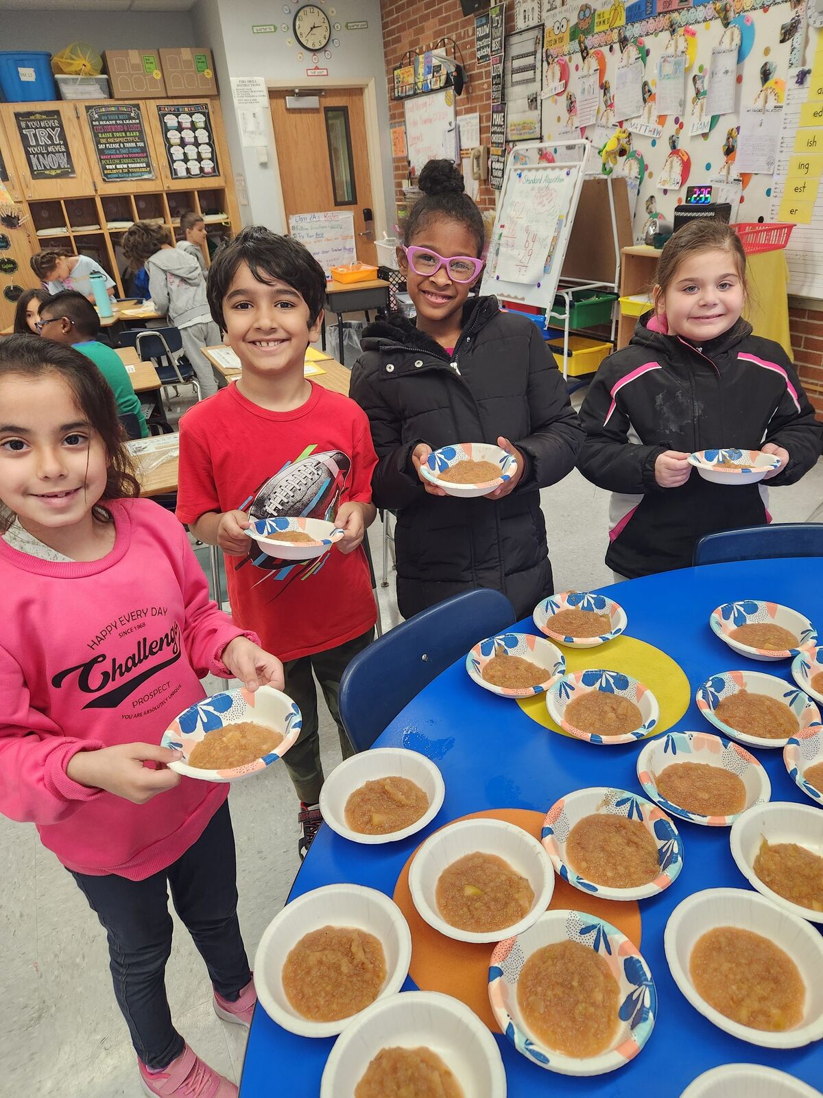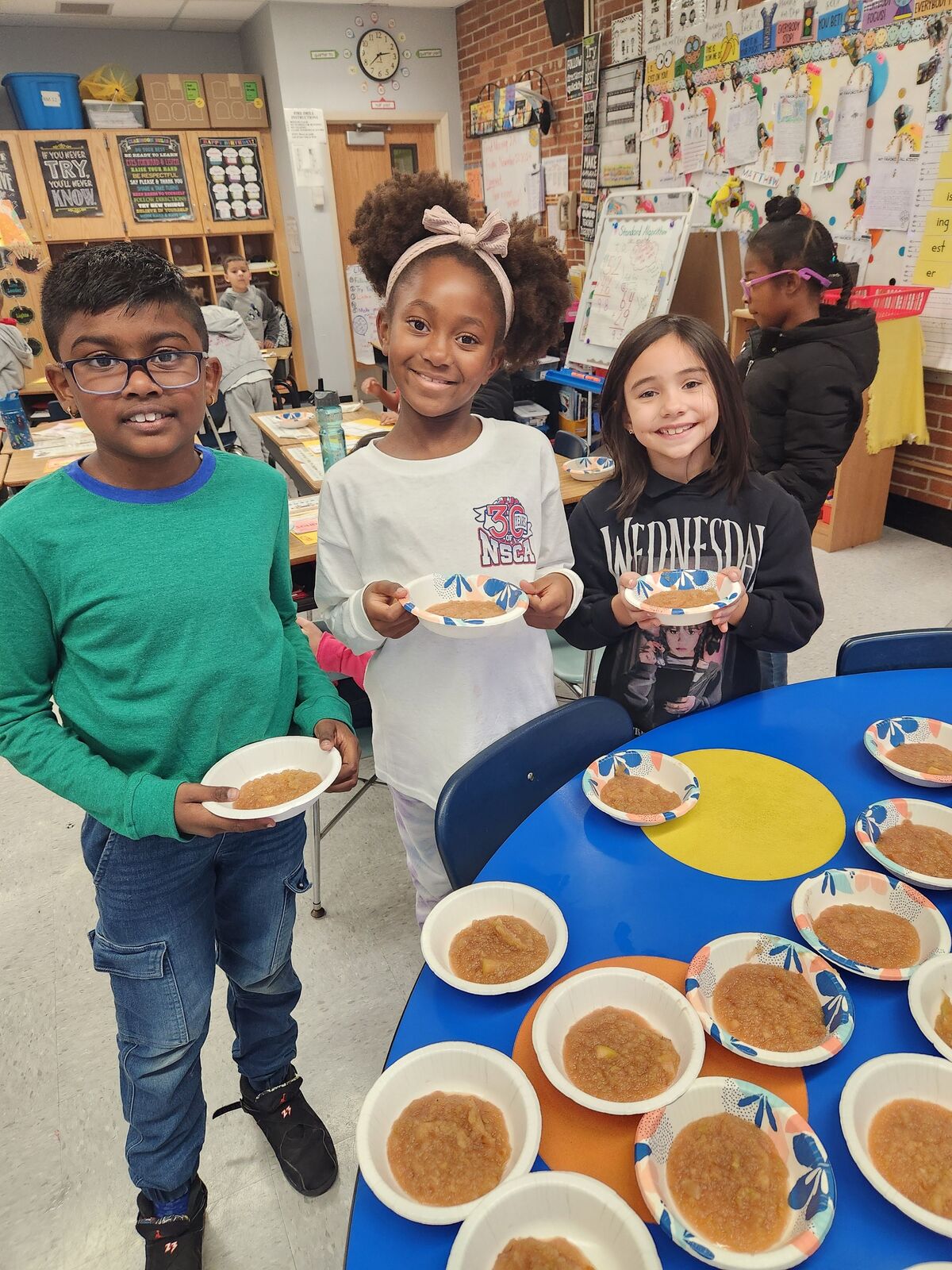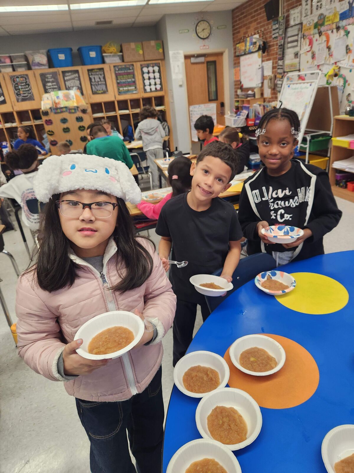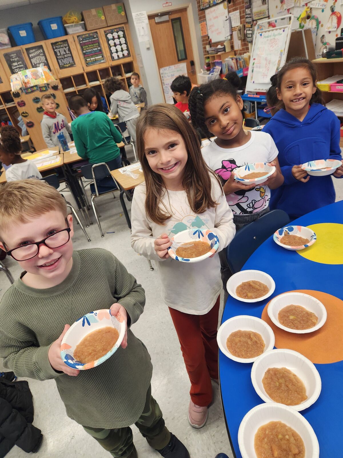 Young scientists in Mrs. Mathon's class made applesauce studying matter today. They enjoyed watching the solid apples) change into a liquid while smelling it cook!